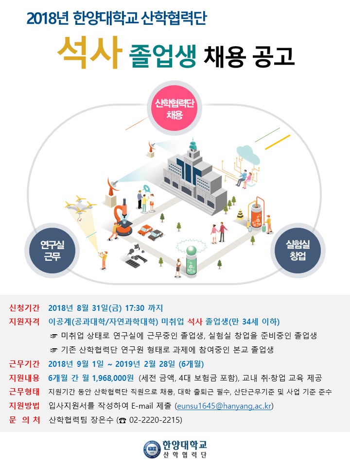 1. 청년TLO육성사업 개요 가. 사업목적: 미취업 이공계 학·석사 졸업생을 산학협력단에서 6개월간 채용하여, 본인이 졸업한 대학 학과의 실험실이 보유한 기술(또는 노하우)을 희망 기업에 이전, 사업화와 창업 촉진 나. 지원기간: 2018년 9월 ~ 2019년 2월(6개월) 다. 지원금액: 인당 월 1,968천원(세전금액, 4대보험 포함, 석사졸업생 기준) 라. 근무형태: 지원기간동안 산학협력단 직원으로 채용(대학 출퇴근 필수) 마. 지원자격: 이공계 미취업 석사졸업생(만 34세 이하) ※ 미취업 상태 연구실 근무중인 졸업생, 실험실 창업을 준비중인 졸업생 등 2. 채용내용 가. 신청기한: 2018년 8월 31일(금) 17:30 까지 나. 지원방법: 입사지원서를 작성하여 E-mail 제출 (eunsu1645 at hanyang.ac.kr) 다. 관련문의: 산학협력팀 장은수(02-2220-2215) 붙임 1. 청년TLO 채용안내 1부. 2. 청년TLO 입사지원서 양식 1부. 끝.