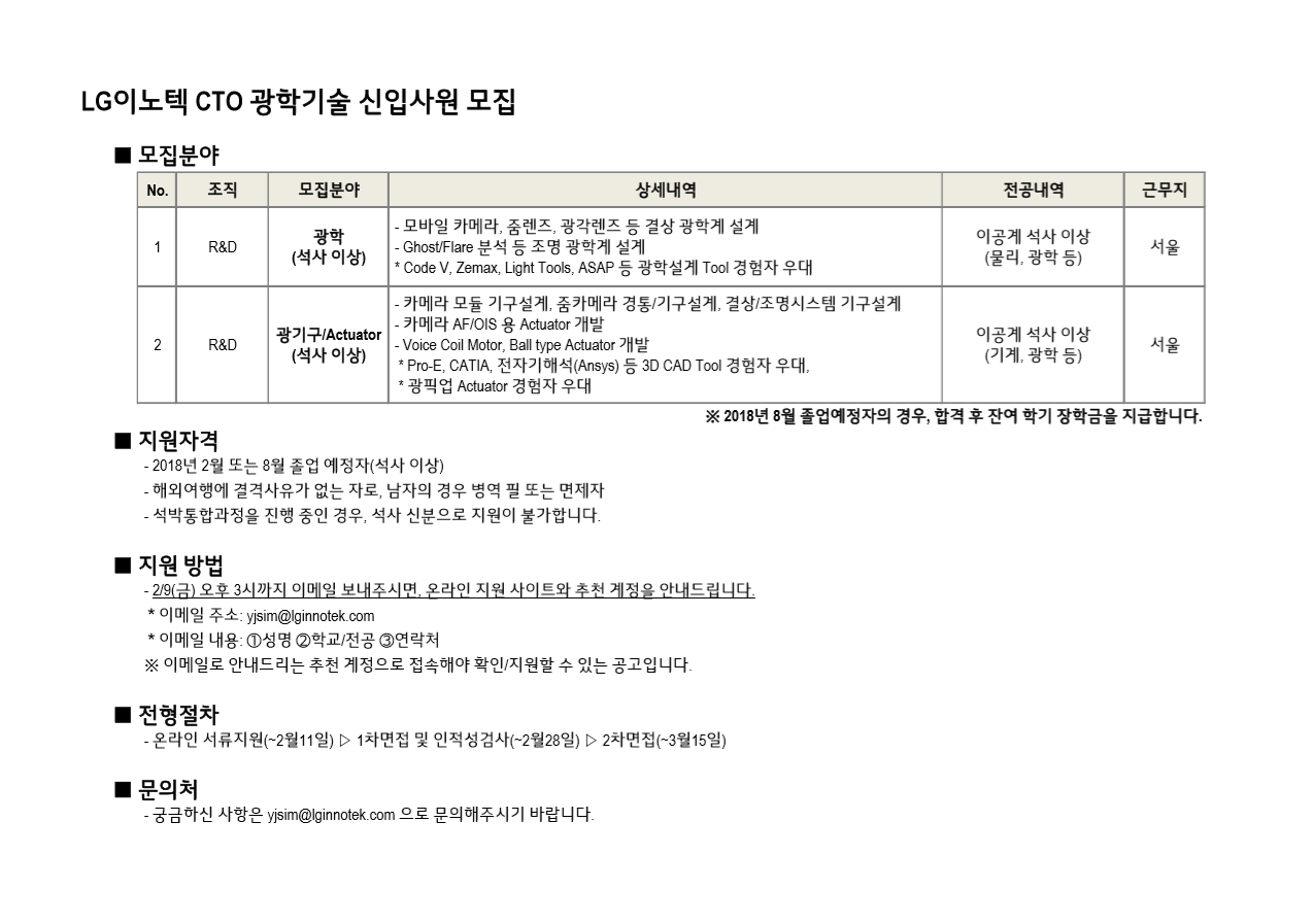 subject: [LG이노텍] CTO 광학기술 신입(석사이상) 사원 모집(~2/9)