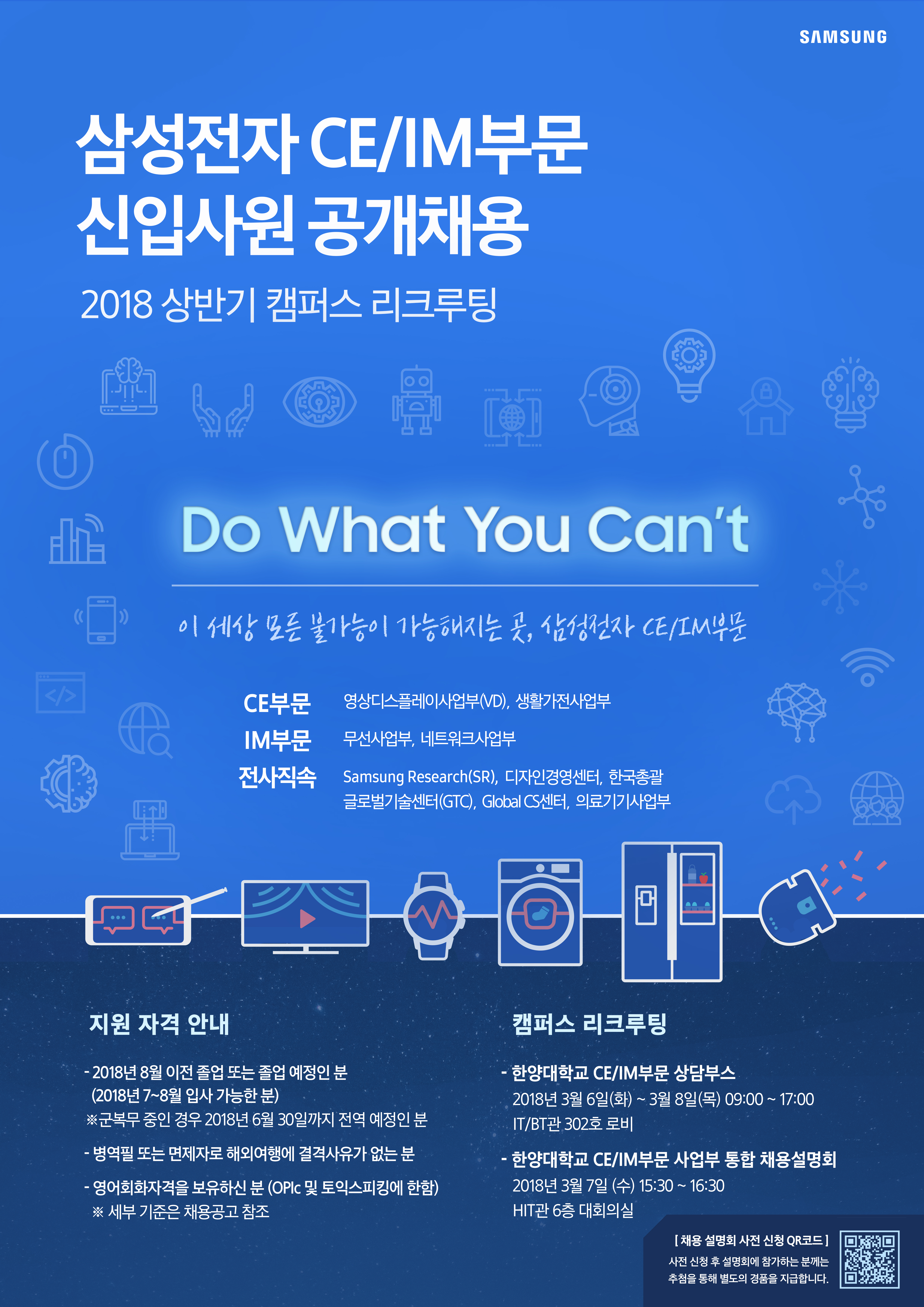 삼성전자 CE/IM 부문에서 신입사원 공개채용 채용설명회를 개최합니다.
