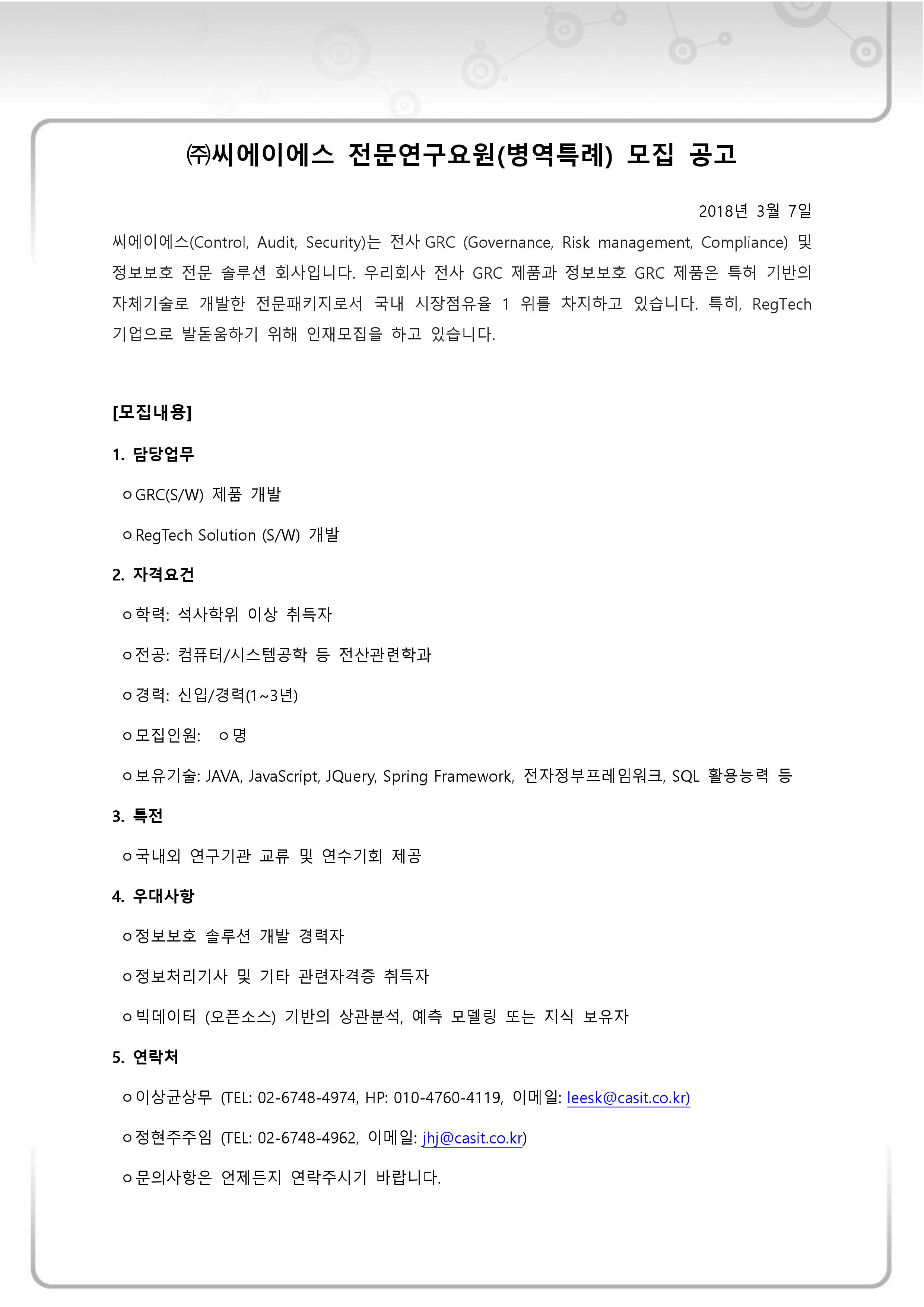 ㈜씨에이에스에서는 첨부와 같이 전문연구요원(병역특례)을 모집하고자 하오니 귀교의 적극적인 협조 부탁드립니다.